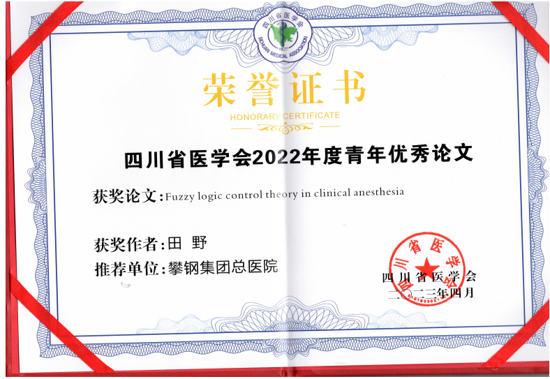 我院麻醉科田野于2022年獲四川省醫(yī)學(xué)會(huì)青年優(yōu)秀論文