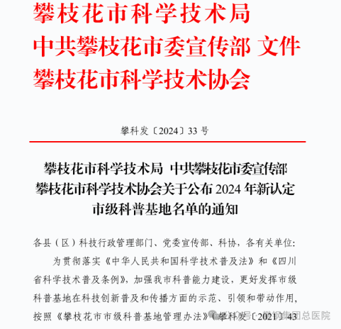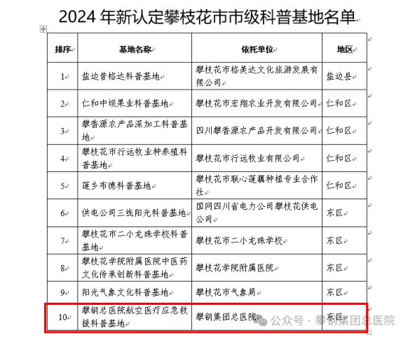 近日,攀枝花市科學(xué)技術(shù)局、中共攀枝花市委宣傳部、攀枝花市科學(xué)技術(shù)協(xié)會聯(lián)合公布了2024年新認(rèn)定市級科普基地名單,攀鋼總醫(yī)院航空醫(yī)療應(yīng)急救援科普基地入選認(rèn)定名單,標(biāo)志著攀鋼總醫(yī)院應(yīng)急救援在科普教育領(lǐng)域邁出了重要一步。
