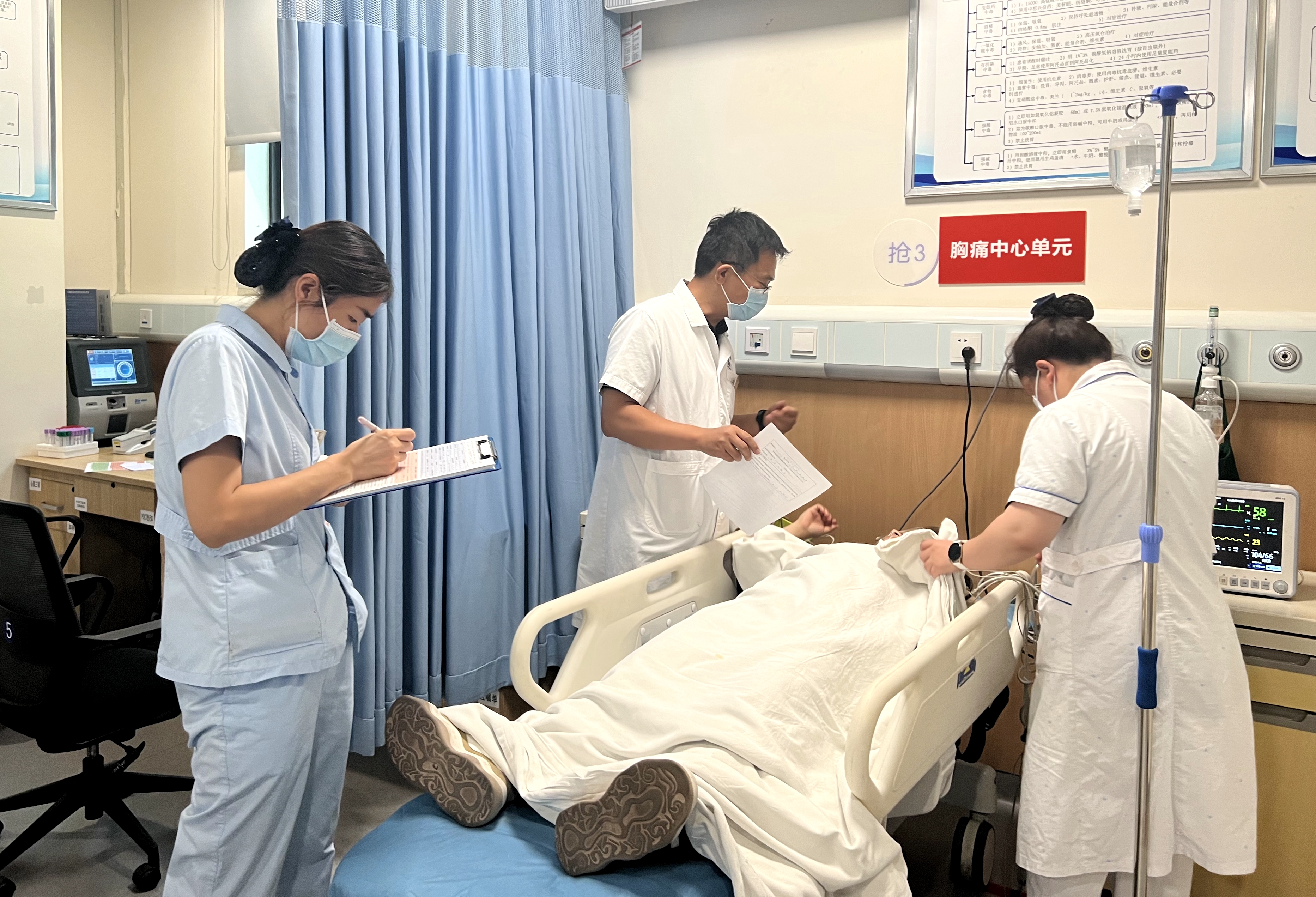 10:50分,“護(hù)士,門口有個(gè)人胸痛走不動(dòng)了......”急診科分診護(hù)士高朝麗見狀,立即輪椅將患者送入搶救室。急診科值班醫(yī)生陸正書詢問患者病史,護(hù)士李成先行床旁心電圖、抽血、查“心肌五項(xiàng)”、監(jiān)測生命體征。