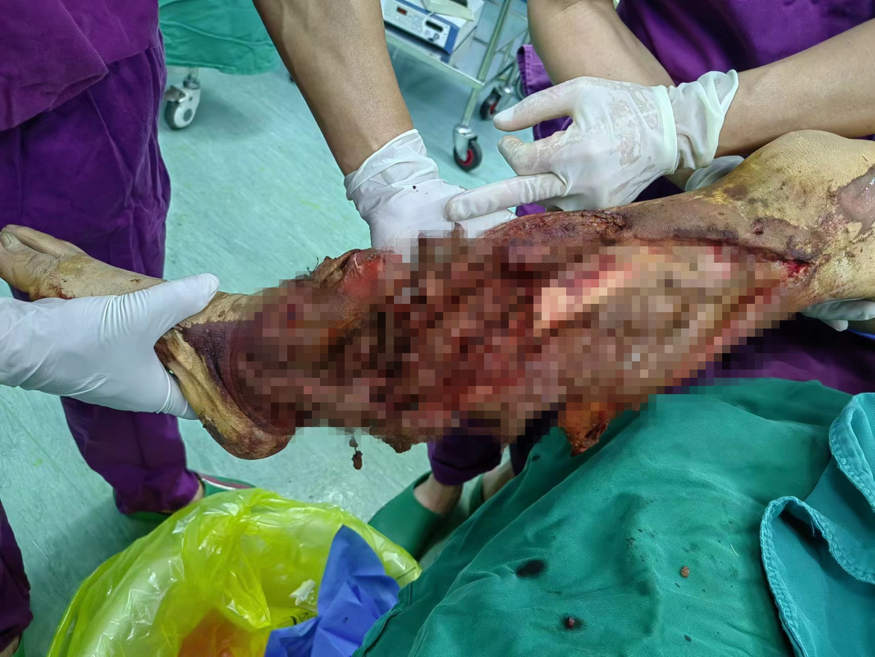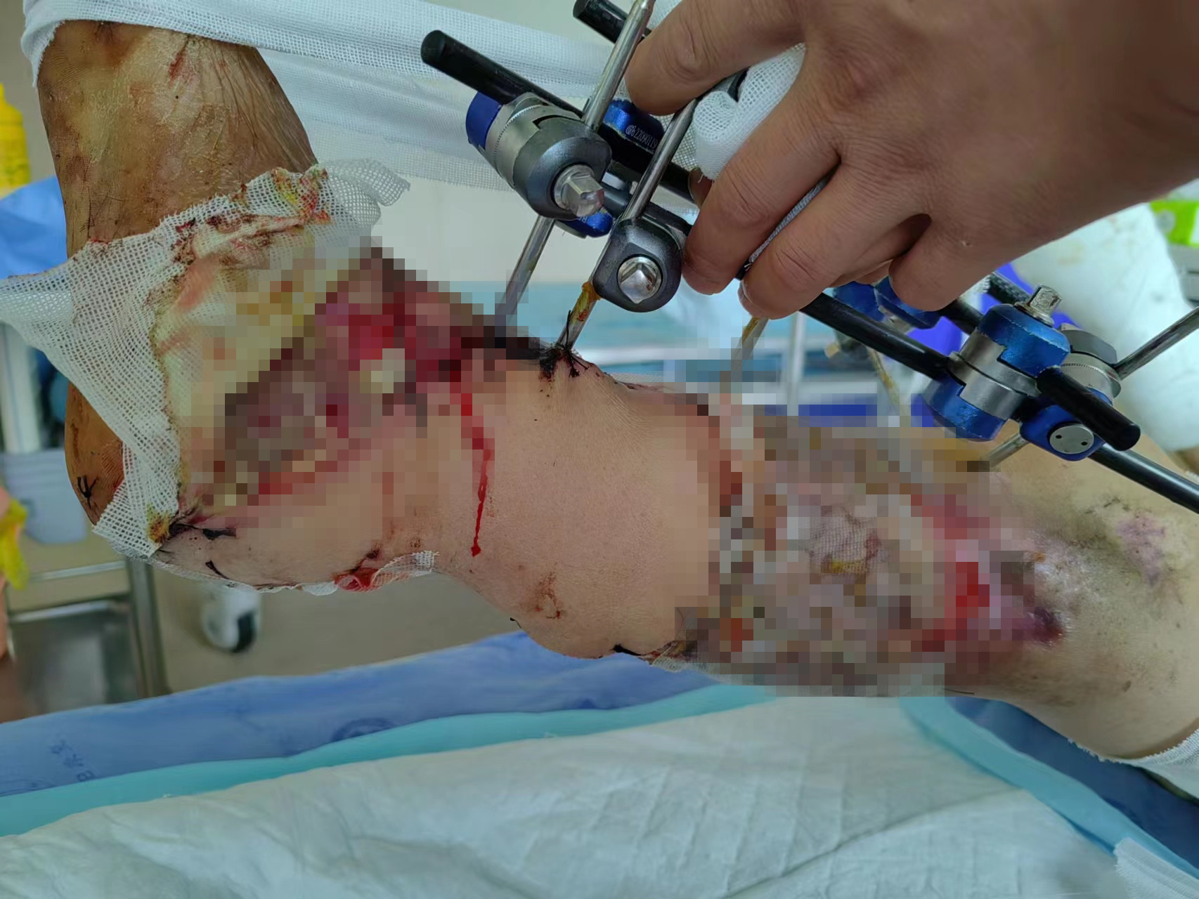 在醫(yī)患溝通中,患者家屬?gòu)?qiáng)烈要求保肢,顯微外科手術(shù)團(tuán)隊(duì)盡最大努力爭(zhēng)取,清創(chuàng)、血管和神經(jīng)吻合、骨短縮……一夜的急診手術(shù)為后續(xù)治療打下基礎(chǔ)。后來(lái)又通過(guò)兩次手術(shù)對(duì)右小腿骨外露進(jìn)行游離皮瓣加植皮修復(fù),經(jīng)過(guò)一個(gè)多月,大大小小三次手術(shù),終于保住了患者的右小腿和腳。