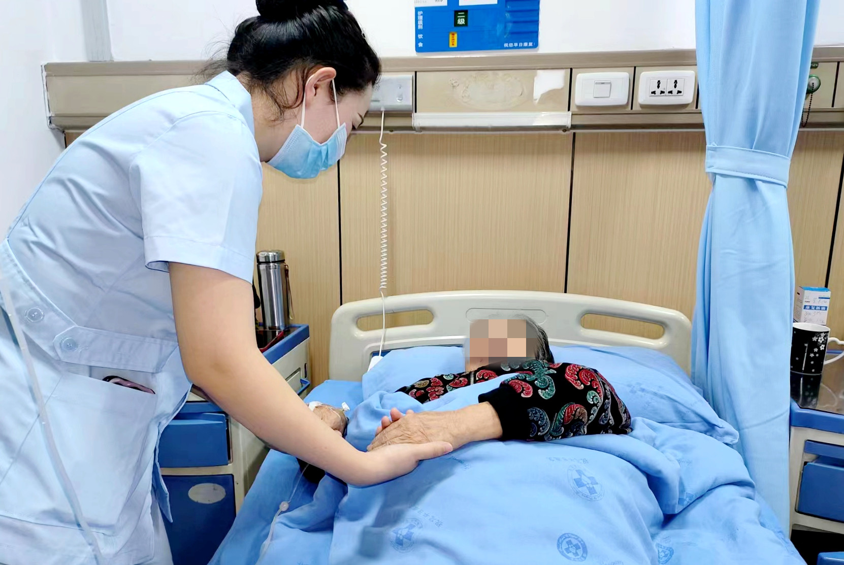 “盡管是放假期間,住院的病人還不少呢,值班的醫(yī)護人員又不多,但是,每天醫(yī)生和護士的床旁查房從沒減少。由于我的病情需要禁食,每天輸液時間很長,輸液藥物引起手背部比較痛,主管護士就每天都準備好熱水袋放在我的手邊,這讓我很舒服,好像都感覺不到疼痛了”。鄧婆婆夸贊護士對她的關心照顧,讓她覺得住院就像在自己家一樣。國慶期間氣溫很高,鄧婆婆來看病時走得又匆忙,帶的換洗衣物較少,驟然降溫讓她措手不及,護士們想到了,做在前,及時給婆婆送衣服和棉被,叮囑她注意不要感冒了,夜間巡房時,輕輕地為鄧婆婆蓋好被子,拉上床檔……