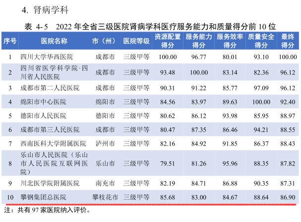 近日,四川省衛(wèi)生健康委發(fā)布了《2022年四川省醫(yī)療服務(wù)與質(zhì)量報(bào)告》。在醫(yī)療服務(wù)能力與質(zhì)量評(píng)價(jià)中,攀鋼總醫(yī)院腎病內(nèi)科在全省三級(jí)醫(yī)院臨床專科綜合評(píng)價(jià)中位列第10。