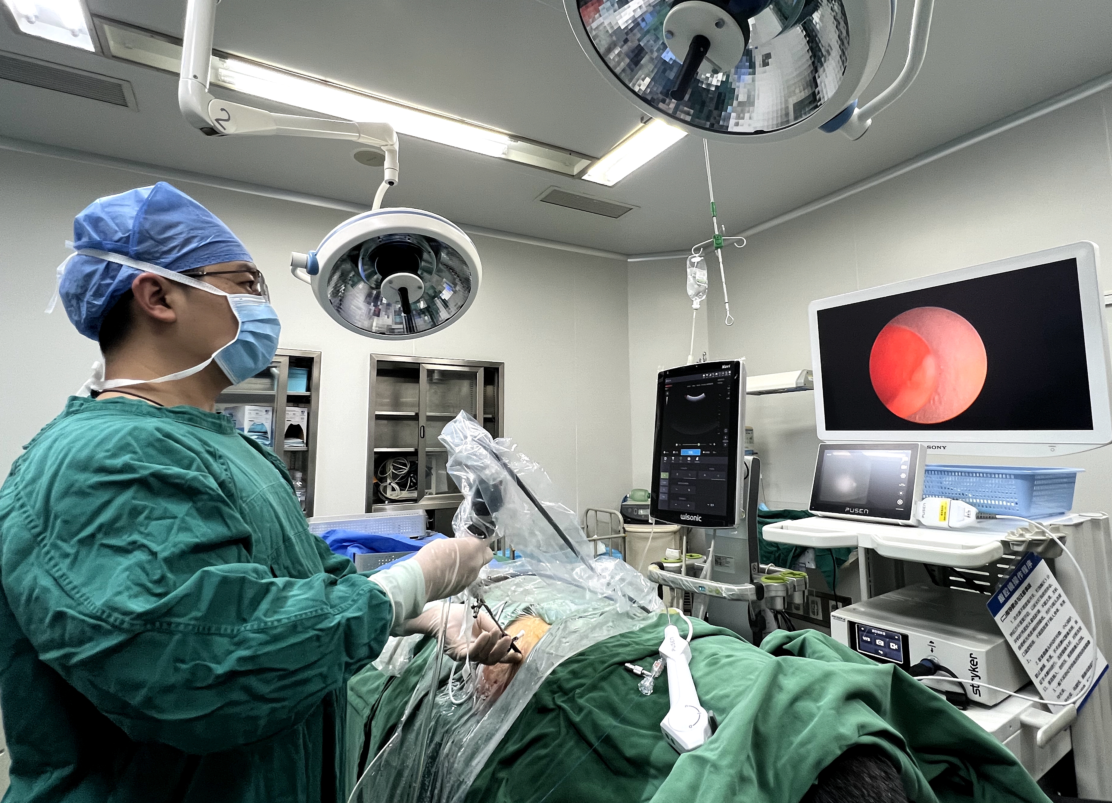 當(dāng)日,患者在全身麻醉下進(jìn)行手術(shù)。主刀醫(yī)生肖川通過(guò)超聲引導(dǎo),精準(zhǔn)穿刺腎臟,建立皮膚與腎臟的腔道,術(shù)中處理完腎盂結(jié)石后,對(duì)比術(shù)前檢查發(fā)現(xiàn)還有極少結(jié)石未被清除。結(jié)石所在位置是腎鏡不能達(dá)到位置,肖川果斷選擇了聯(lián)合軟鏡治療。軟鏡相比硬鏡的優(yōu)勢(shì),就在于軟鏡可以在腎臟內(nèi)轉(zhuǎn)彎,到達(dá)硬鏡不能及的位置,可以更大程度上提高碎石清石率。腎鏡+軟鏡,腎臟內(nèi)多發(fā)的結(jié)石全部清除干凈。術(shù)后觀察無(wú)明顯出血,尿液清亮,造瘺管無(wú)明顯的出血,呈現(xiàn)淡紅色。