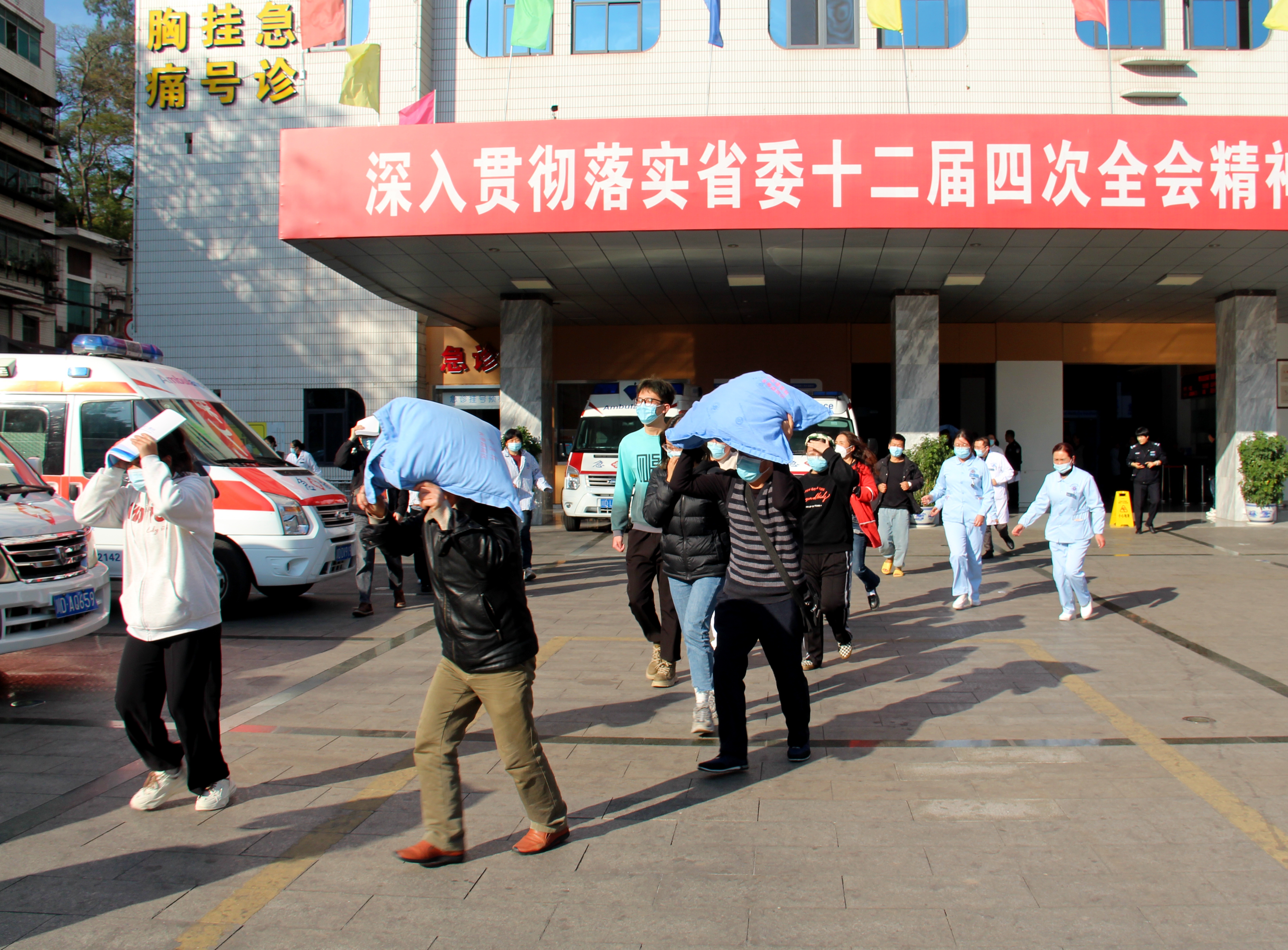 演練模擬接到地震信息后,醫(yī)院啟動防震減災(zāi)應(yīng)急預(yù)案,科室醫(yī)務(wù)人員接到地震通知,迅速組織病區(qū)患者及家屬就近避險,并做好疏散準(zhǔn)備。聽到疏散警報響起,立即組織人員以最快的速度按照規(guī)定的路線緊急疏散。對無法行走的重病人、地震受傷人員由醫(yī)護(hù)人員用擔(dān)架緊急運(yùn)送至指定集結(jié)點(diǎn)。各集結(jié)點(diǎn)負(fù)責(zé)人統(tǒng)計疏散總?cè)藬?shù);醫(yī)療救護(hù)組立即進(jìn)行現(xiàn)場傷員救治與病員轉(zhuǎn)運(yùn);后勤保障組進(jìn)行臨時醫(yī)療場所(帳篷)搭建,災(zāi)損評估與報告;公共衛(wèi)生科進(jìn)行后續(xù)衛(wèi)生防疫消殺。