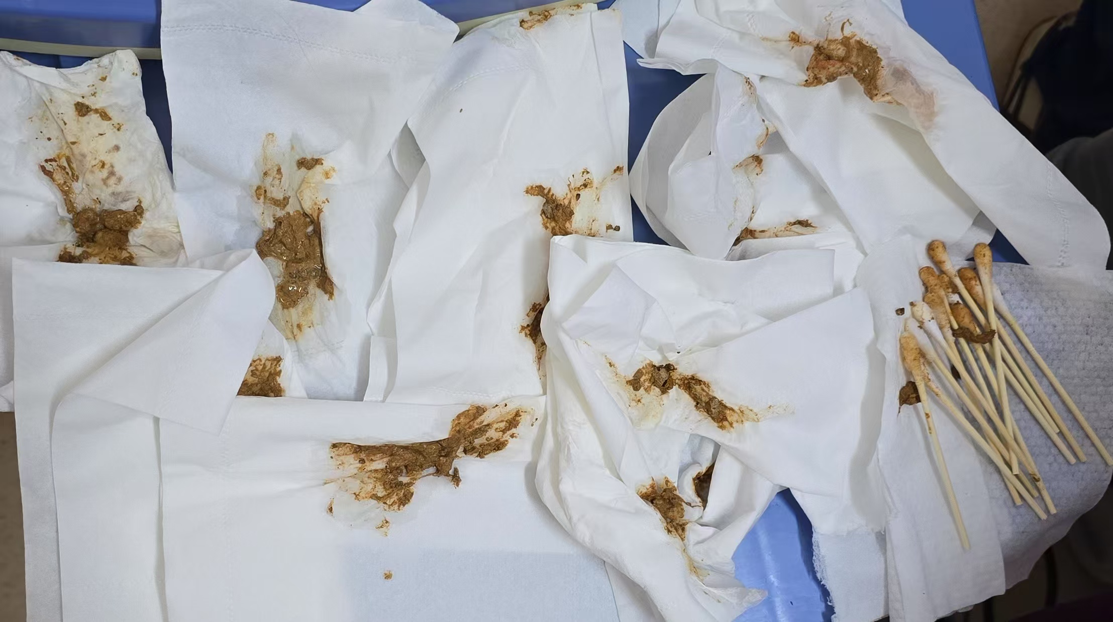鏡下景象令所有人倒吸涼氣——泥沙及小石塊不僅填滿鼻腔、口腔,更在左主支氣管部分栓塞,右主支氣管形成致密栓塞“泥漿”封死。團(tuán)隊(duì)采用分步灌洗、負(fù)壓吸引、異物鉗精細(xì)夾取的綜合策略,既要避免泥沙沖入更深部位,又要防范操作誘發(fā)喉痙攣?;颊咭騽×覇芸榷啻?,在纖支鏡的方寸之間展開拉鋸戰(zhàn)。