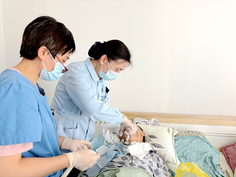 險(xiǎn)情解除后,三人并未離開(kāi)。王楊芳再次全面評(píng)估病情,檢查下肢褥瘡情況,指導(dǎo)預(yù)防措施;何曉琴手把手教學(xué),為家屬詳細(xì)講解氣管切開(kāi)管路清潔、吸痰規(guī)范及并發(fā)癥識(shí)別;