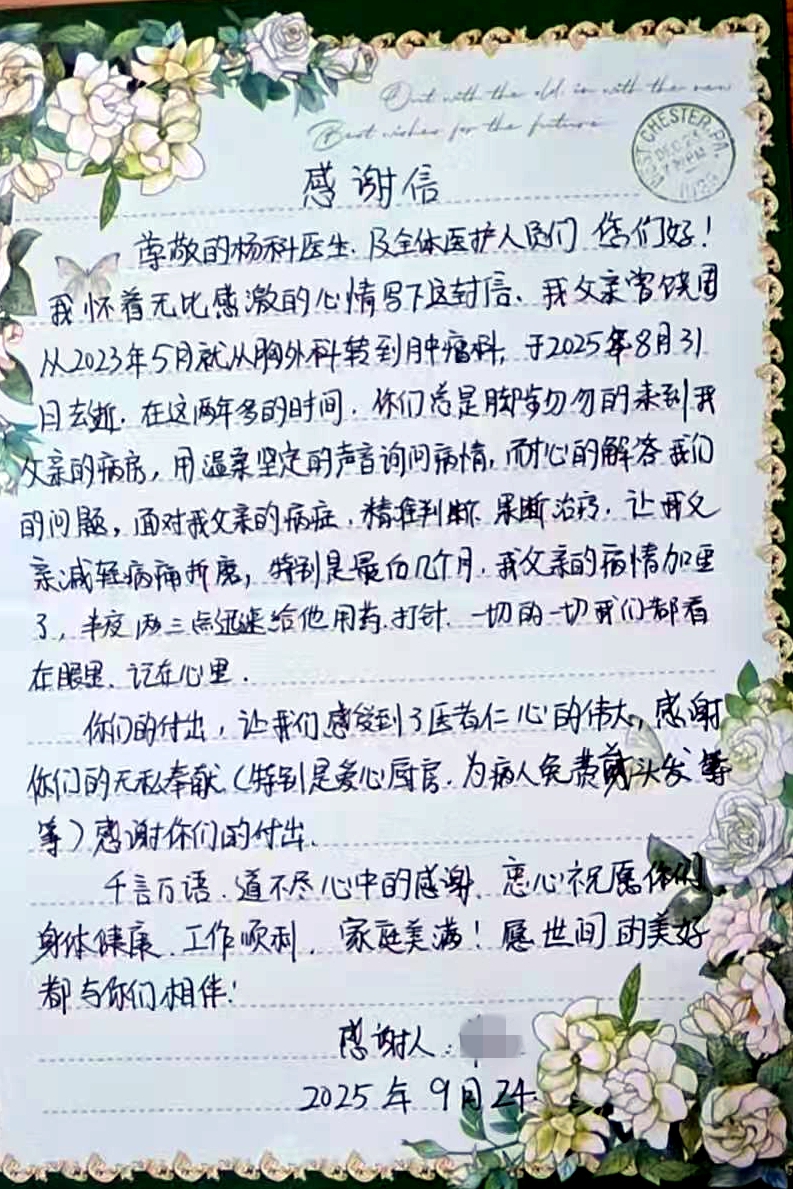 “父親病重時(shí),你們不辭辛勞,深夜緊急趕到病房對(duì)癥治療,減輕了他的痛苦。愛心廚房、免費(fèi)理發(fā)……一樁樁小事溫暖著我們。祝你們身體健康,愿世間美好與你們相伴?!?月23日,攀鋼總醫(yī)院腫瘤科楊科醫(yī)生收到了一份珍貴的禮物——患者曾先生的家屬送來的手寫感謝信和錦旗。真摯的文字,再次喚醒了那段跨越生死的醫(yī)患溫情。